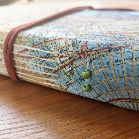 Travel notebook journal, hard covers with vintage map image fabric, envelope pockets & journal extras