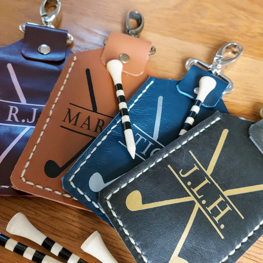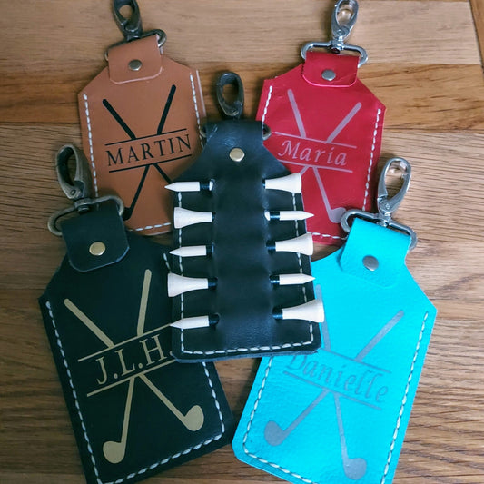 Custom leather clip-on golf bag tag tee holder and golf tees, fabulous personalised golfing gift
