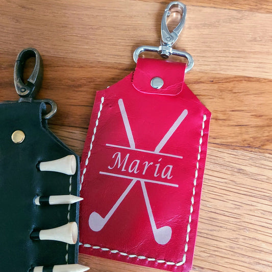 Personalised leather clip-on ladies golf tee holder in Red, fabulous personalised golfing gift