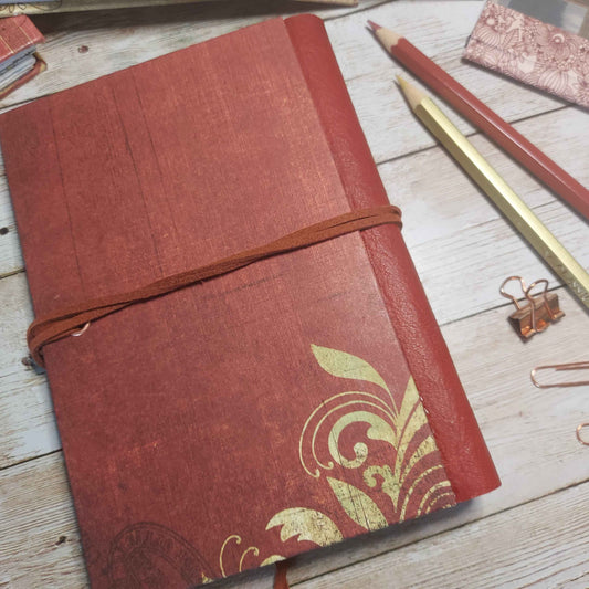 Mixed Paper Junk Journal Notebook - A6 Red Hardback, Leather Spine